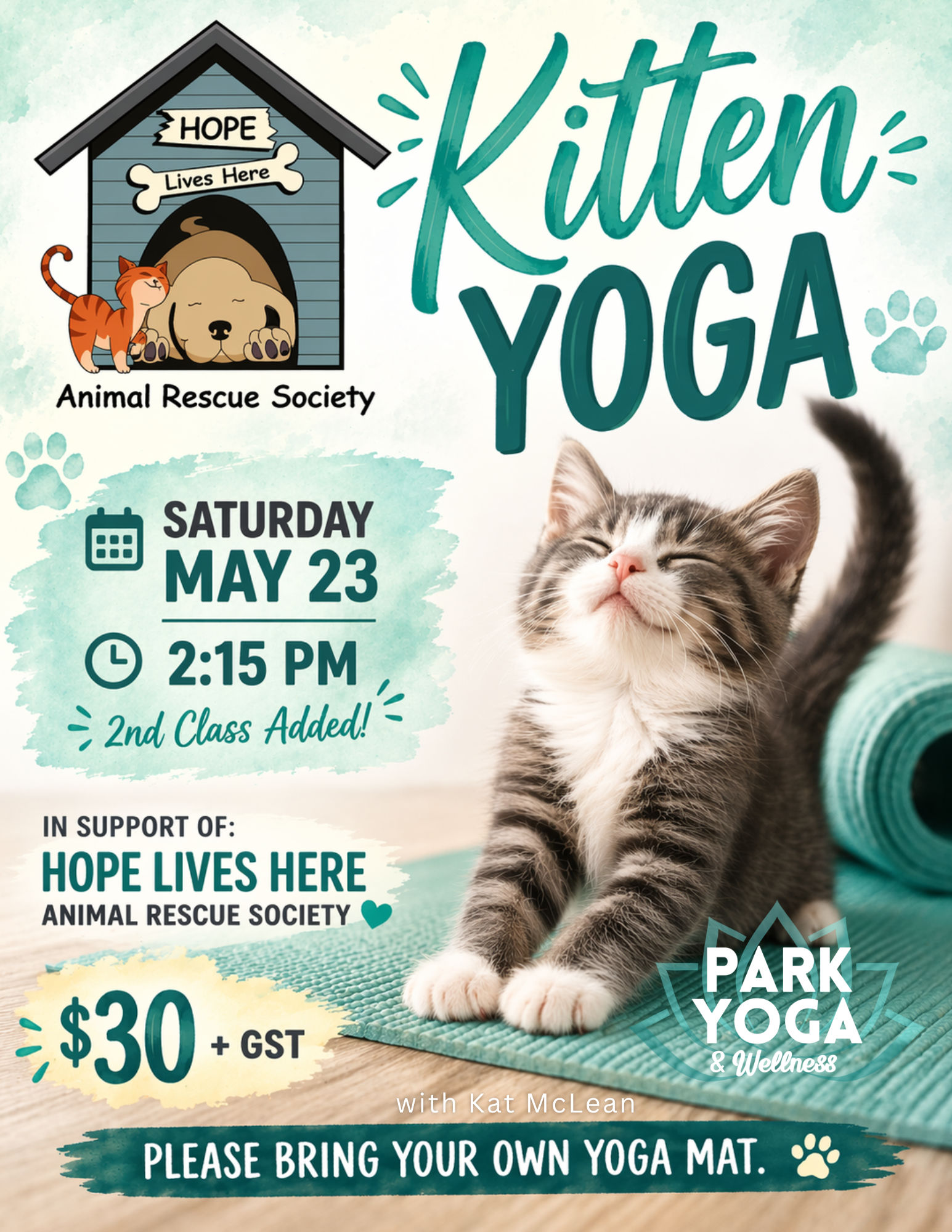 Enjoy a gentle, all-levels yoga class surrounded by adorable, adoptable kittens while supporting a wonderful local cause. This special event is held in support of Hope Lives Here Animal Rescue, helping rescue animals find loving homes.